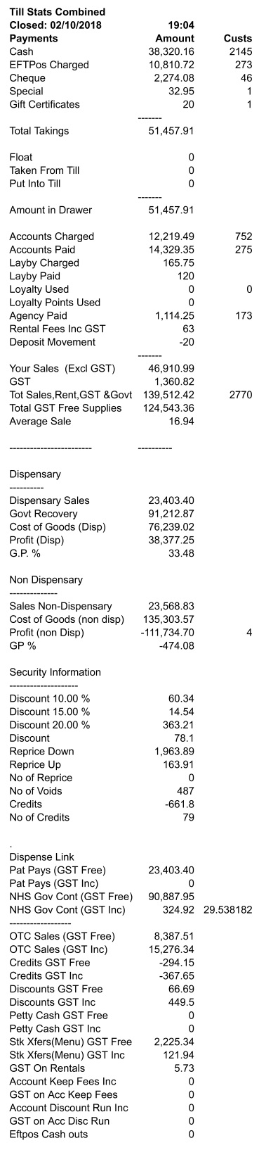 You will get a Z report for the server, “till 1” (which will be full of $0 figures if you don’t use your server to make sales), a Z report for “till 29” which is your Dispense Link, so only the Dispensary half of the document will have figures, and finally the Global Z report, which totals all of the Z reports in the store together and gives you totalled figures.