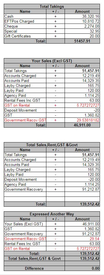 Below left is a sample of a Z report, and on the right is an explanation of how we calculate some of the totalled fields which you might use for your accounting.